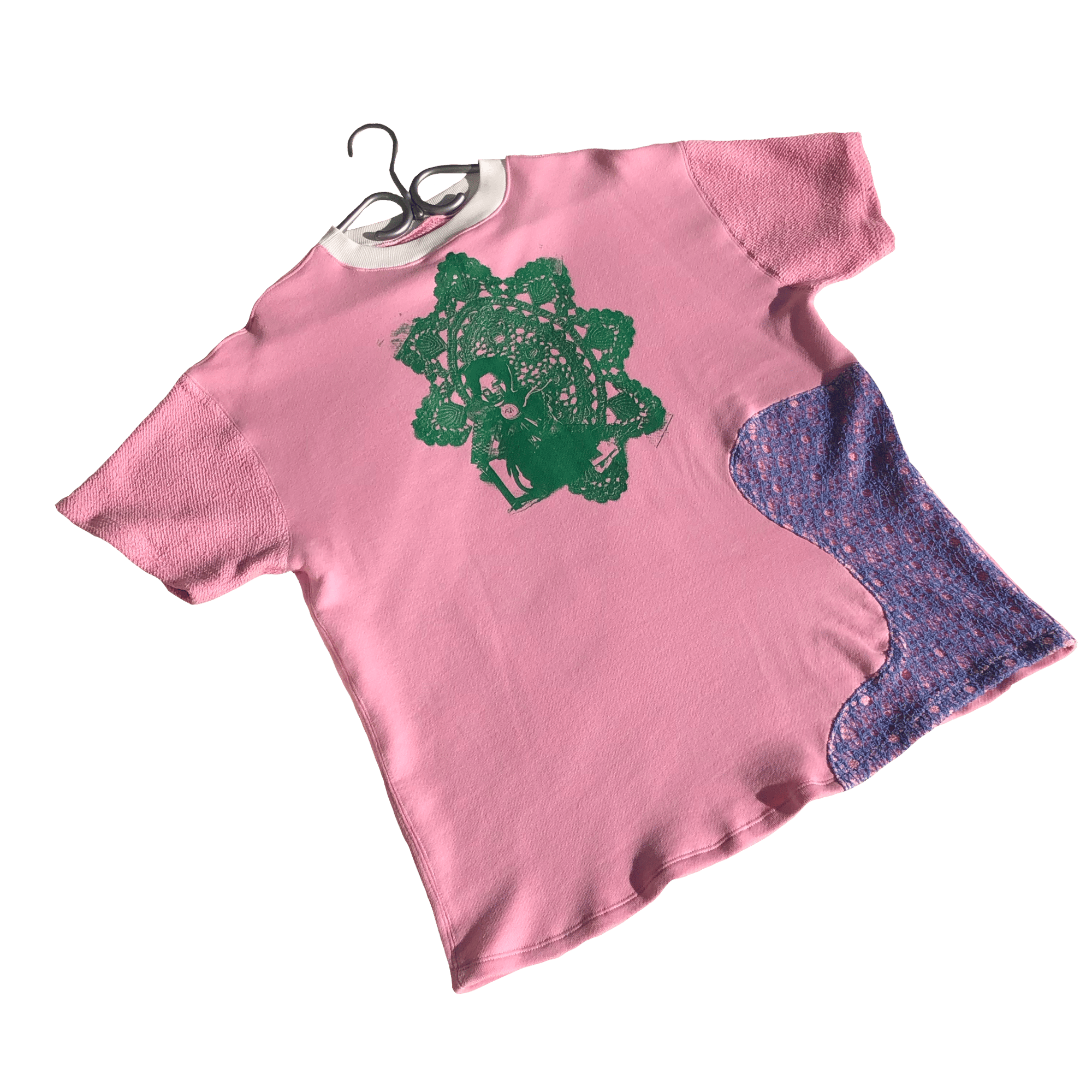 French terry bubble gum pink tee with reverse sleeve detail and powder blue lace patch. It is screenprinted with a collaged design of nonna nina and a handmade doily.